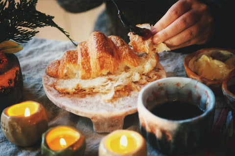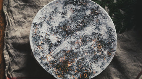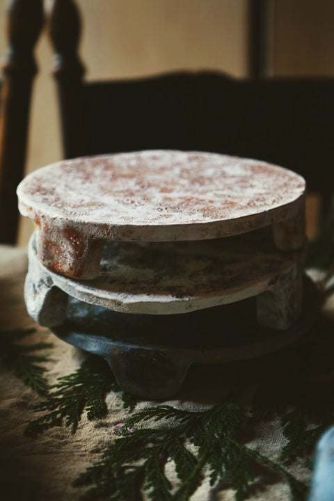 Hand-molded stone-style slabs inspired by old farm kitchens and winter gatherings. Perfect for charcuterie, morning toast rituals, candle nooks, and small seasonal snacks.